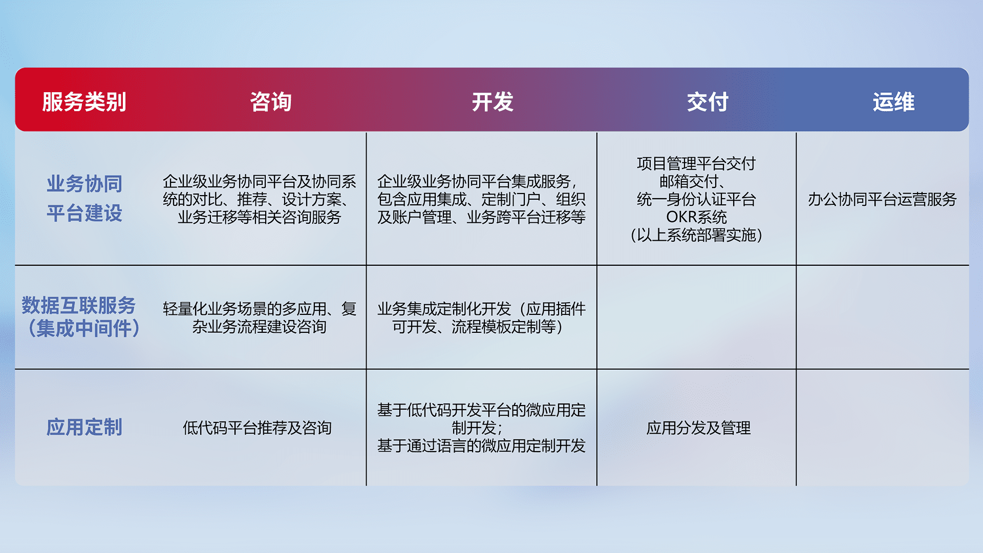 针对钉钉、、、企微、、、、IDaas等平台级产品提供产品的规划、、、、方案、、交付、、、定制化开发等服务,,,实现如统一协同办公、、智能客户服务、、、、混合会议管理、、、、智能数据查询、、、等业务场景,,实现数字化转型。。。