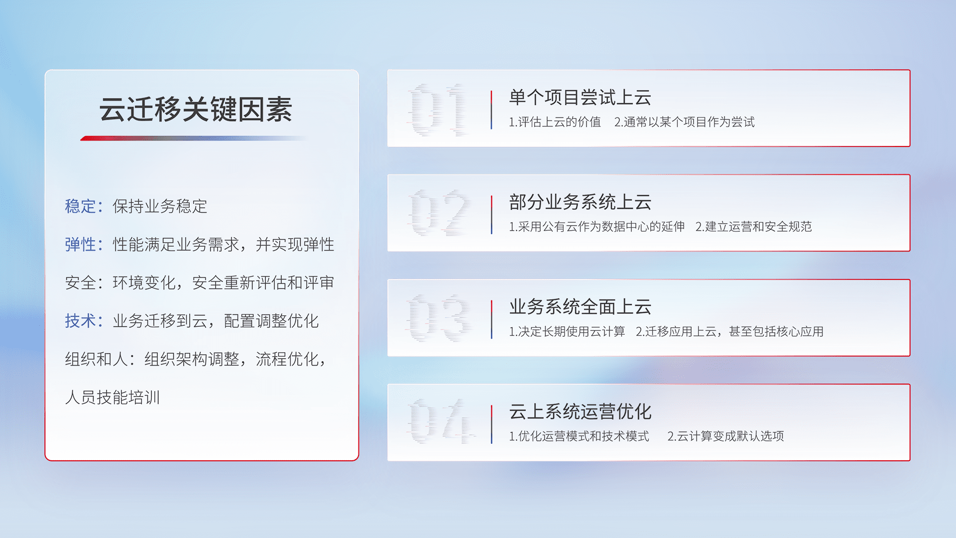 结合实际业务,,,从规划设计、、、云平台选型、、云原生改造、、、、数据迁移、、集成交付,,迁移全过程为客户识别最佳上云路径,,,,做好风险识别管理,,设计网络架构、、、身份权限、、、、安全审计合规、、操作审计、、、、日志审计、、监控告警策略、、、多站点容灾设计等,,,对云上基础设施进行整体规划,,提升IT治理水平,,,,以满足弹性、、、高可用、、、、高性能的需求。。。